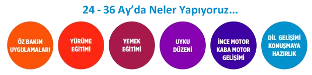 24 - 36 Ay döneminde çocuklar çevrelerin keşfetmekten ve bağımsız davranmaktan çok keyif alırlar. Bu yaş grubunda öz bakım temizliği, eğlenceli oyunlar ve beslenme konularına dikkat edilir.
